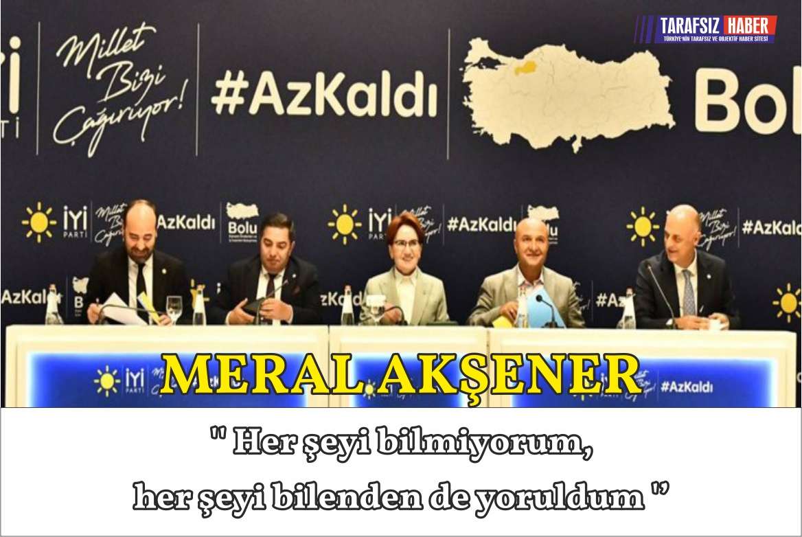İYİ Parti Genel Başkanı Meral Akşener Bolu Belediyesi yeni itfaiye binası açılış töreninin ardından bir otelde düzenlenen Kanaat Önderleri ve İş İnsanları Buluşması’na katıldı. Sözcü’nün aktardığına  göre, gerçekleştirdikleri toplantının formatı hakkında bilgi veren Akşener şu ifadeleri kullandı:   “Burada olmak gerçekten heyecan verici bir durum. Bizim formatımız şu; öncelikle kısa bir konuşma yapıyorum, sonra bizim ekonomi kurmaylarımız buraya diziliyoruz, siz konuşmaya başlıyorsunuz. Eleştirileriniz, tavsiyeleriniz ve durum tespitleriniz, sizin bulunduğunuz alanlara yönelik gördüklerinize gelmek istediklerinizi söylüyorsunuz. Sorularınız varsa biz cevaplandırıyoruz. Soruların siyasi tarafına ben cevap veriyorum, ekonomiye dair her sorunuza arkadaşlarımız cevap veriyor. Bunu niye böyle yapıyoruz? Çünkü ben her şeyi bilmiyorum. Her şeyi bilenden de yoruldum. Dolayısıyla benim en iyi bildiğim konu siyaset. 27 senedir bu ülkede bir kadın olarak sağ kalmışım siyasi olarak. Demek ki iyi bildiğim bir alan orası benim. Benden daha iyi bilen elbette vardır ama her bir konuda fikri olur insanların ama bilgi başka bir şeydir.”